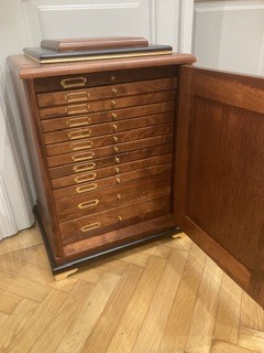Antik, art deco tömör cseresznyefa szekrényke kifejezetten falerisztikai/numizmatikai célra átalakítva, 23 karátos arannyal díszítve.