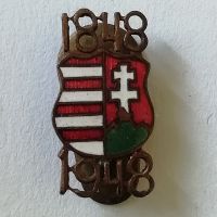 1947-ben az évfordulóra gyártott aprócska zománc jelvény, kompozícióban a Magyar Posta által az eseményre kiadott bélyegsor egyik értékével.