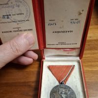 Az 1965 tavaszán bekövetkezett árvíz (a háttérkép Pócsmegyert mutatja az árvíz idején) során, az árvízvédelmi munkákban aktívan részt vettek elismerésére új emlékérmet alapítottak, amelynek modelljét 1965. május 9-én mutatták be. Mellette a megvalósult kitüntetés előlapja.