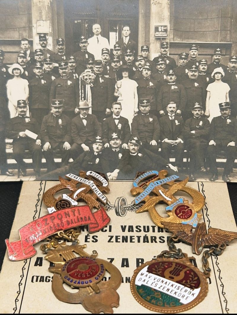 Csokorba szedtem az általam eddig fellelt vonatkisérő dalkörök jelvényeit. A háttérben lévő csoportfotón a Miskolczi Vonatkisérök Dalköre látható a soproni országos dalosversenyen 1925-ben.